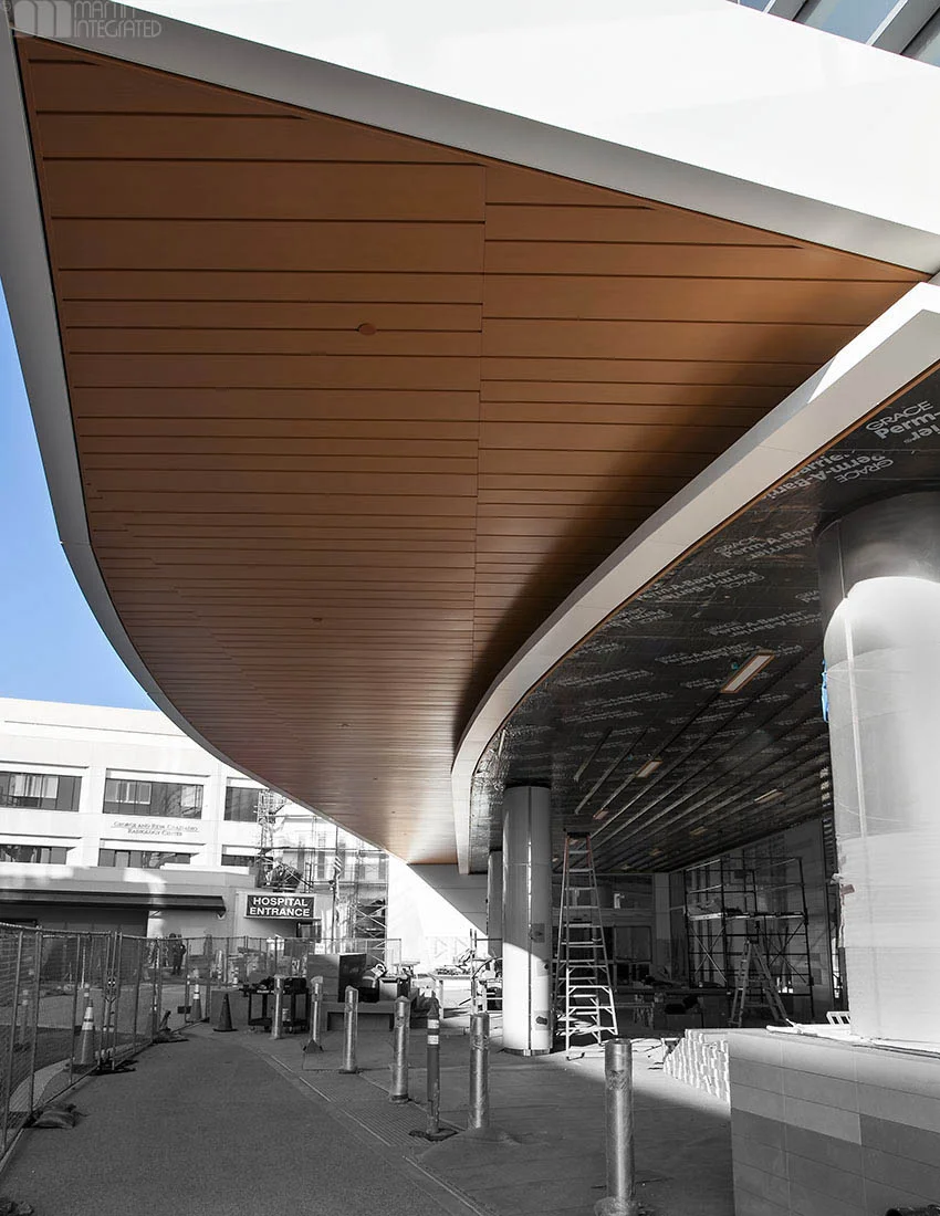A high-end wood slat ceiling in progress.Torrance Memorial Hospital: